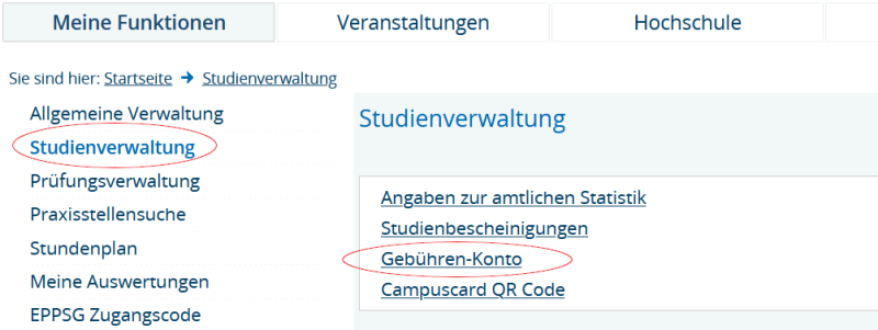 Ihr Gebührenkonto können Sie über Meine Funktionen - Studienverwaltung - Gebührenkonto aufrufen: